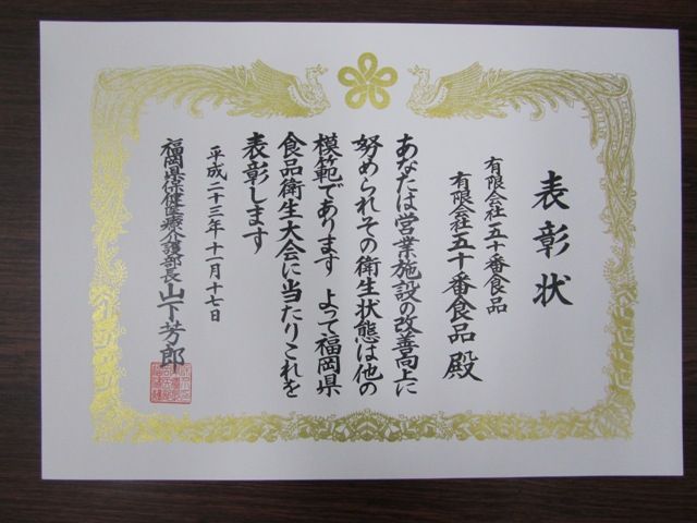 ここで表彰式が行われたんですが、五十番食品がなんと「食品衛生優良施設 福岡県介護部長表彰」を受賞しました
