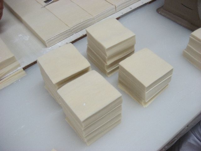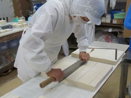 ← そして「焼売皮」や「ワンタン皮」は、規定の角型に長い包丁でカットしてきます。