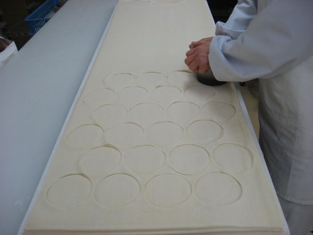 ← こちらを、「餃子皮」だったら、丸い型枠でくり抜いていきます。型枠は直径の違うものが数種類ございます。
