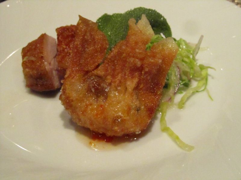 ← 「鶏のコンフィと帆立ウニソース炒め」。写真手前の帆立のウニソース炒めは、皮で包んで揚げていました。
