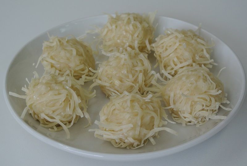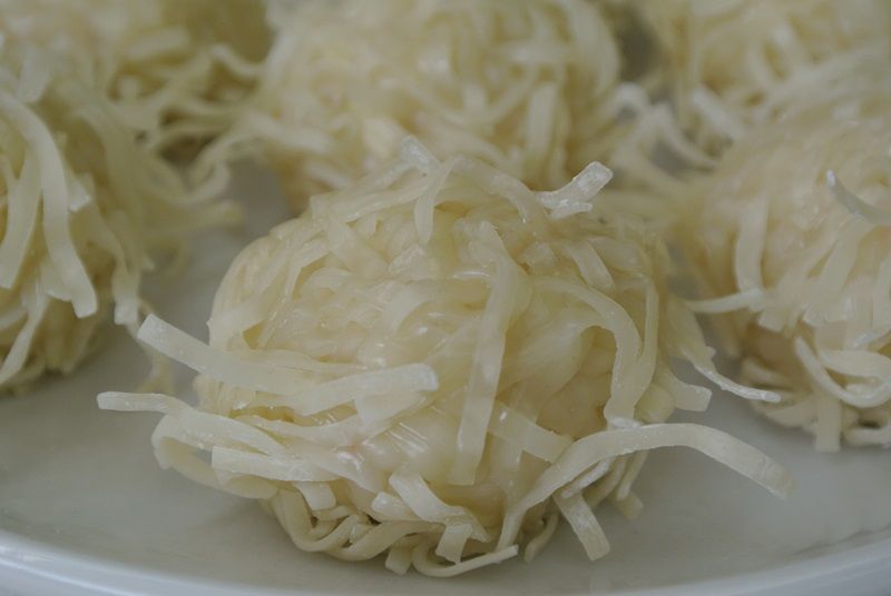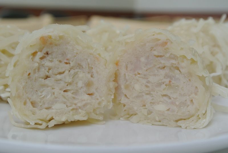 豆腐と鶏肉をベースにしたあんに、刻んだ焼売の皮をまぶしています。