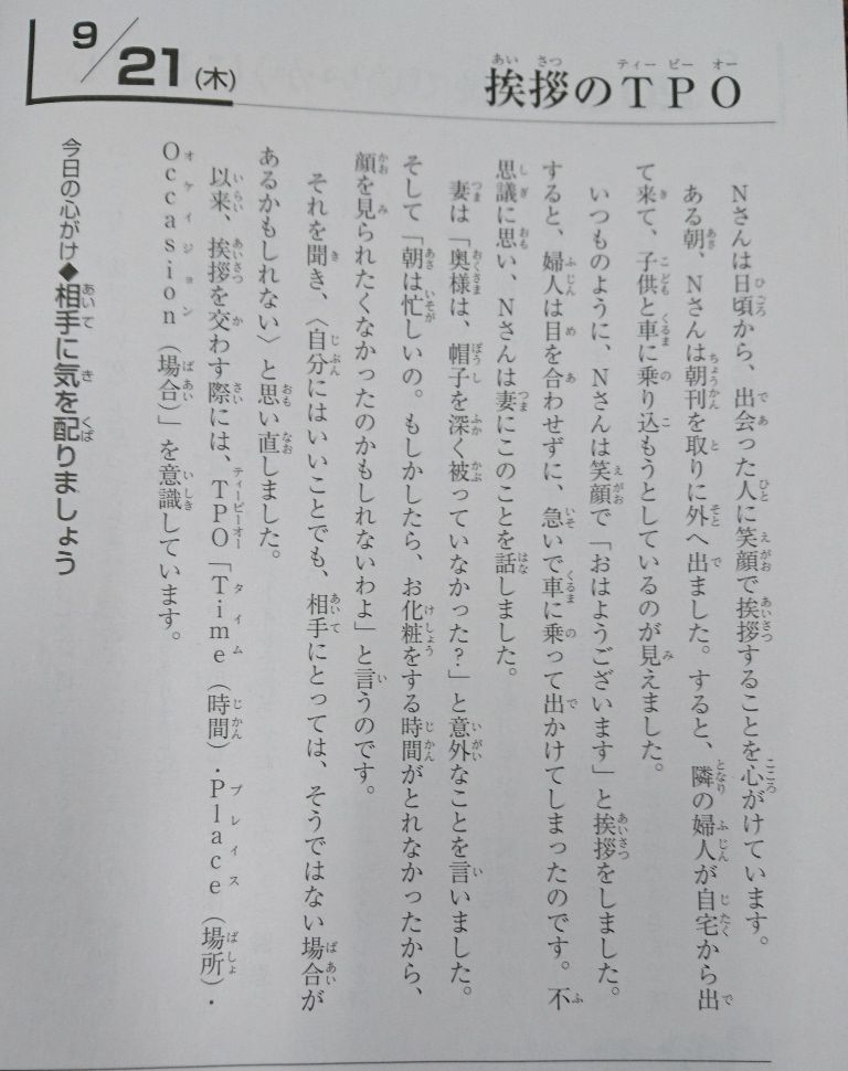 」と、会社到着から数十秒で逃げるように帰って行ったのでした。。。今日の職場の教養をもう少し早く読んでいたら、常務も別の対応をしてくれたのかもしれません。。。