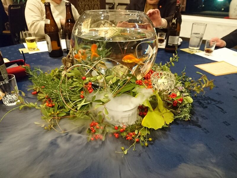 「今日はどんな料理なんだろう?」とワクワクしながら会場に入ると、テーブルには金魚鉢。