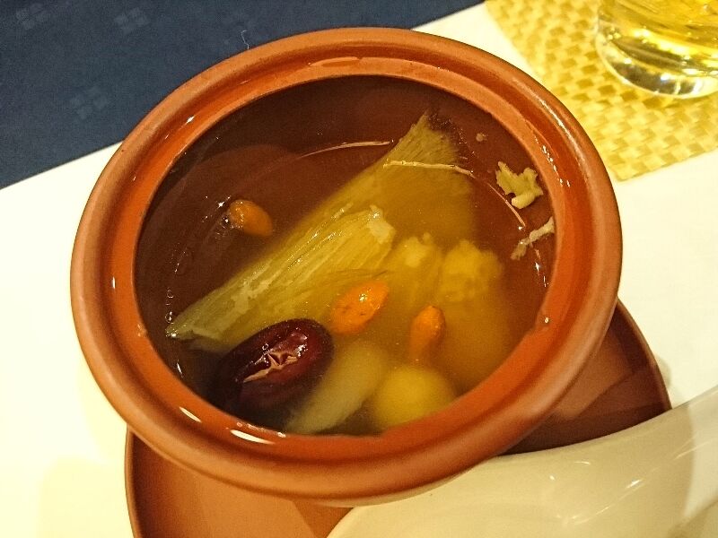 たっぷりのふかひれスープの中に、いろいろな食材が入っていました。