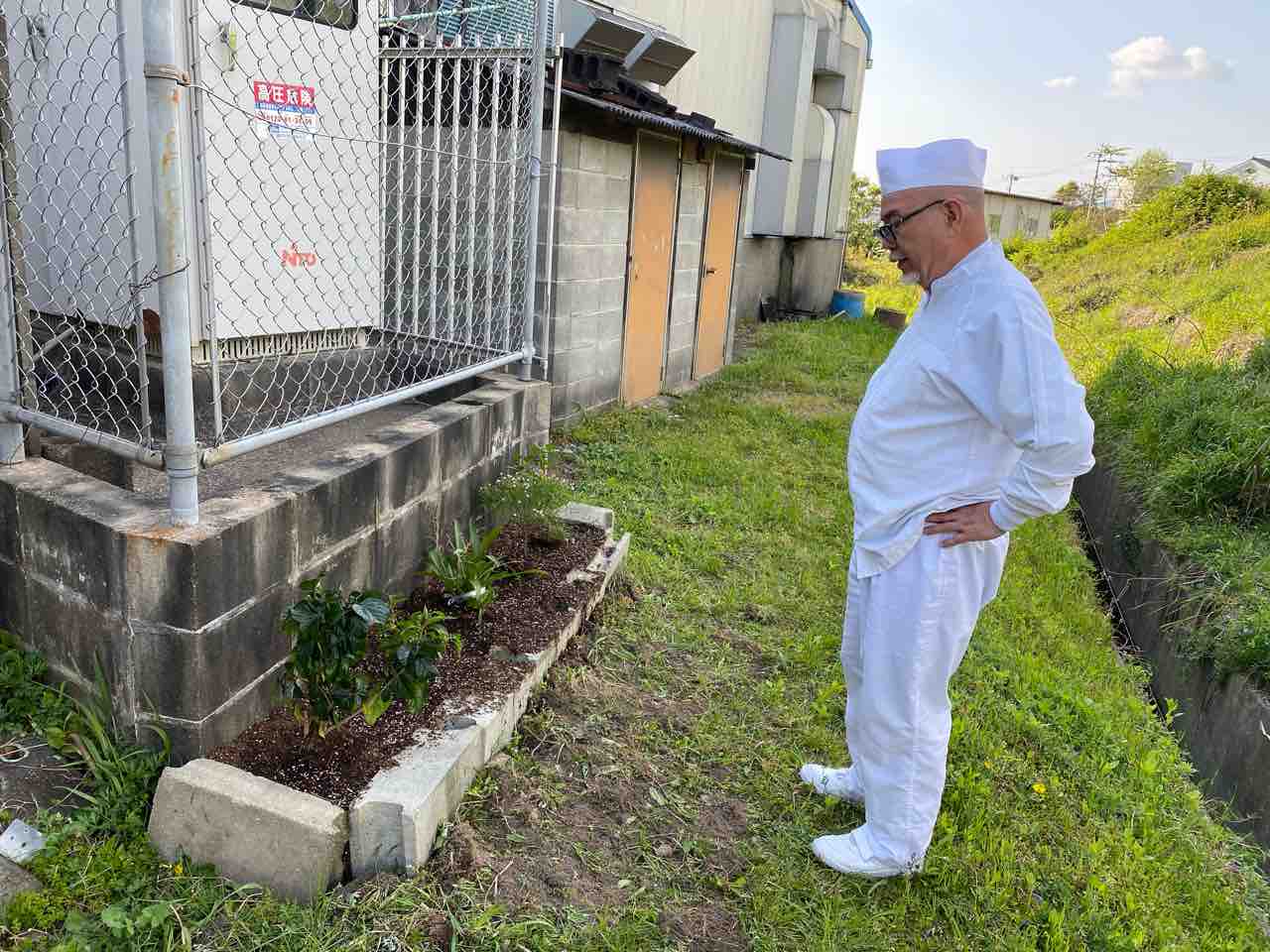 常務が毎日お世話してくれていますが、いつまでも鉢の中なのはかわいそうと思ったのか、会社の裏に小さな花壇を作ってくれました。