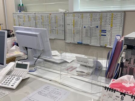 とにかく考えられるリスクはひとつひとつつぶしていこうと、一日中事務所にいる事務員が向かい合わせで座っている机と机の間にシールドを置きました。