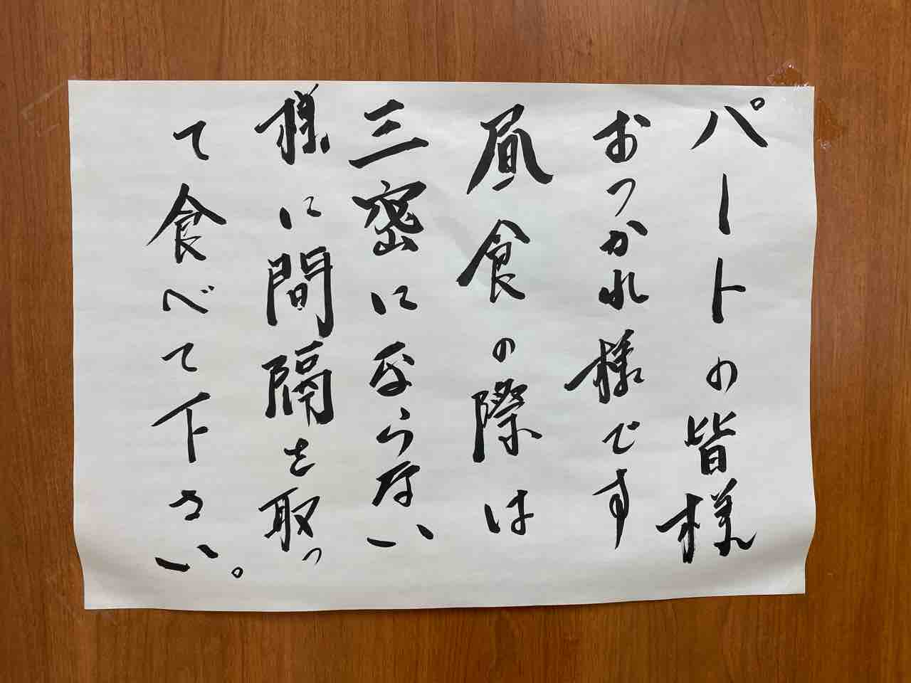 パートさんたちも昼食の時間が大切なコミュニケーションの時間だと思いますが、今は感染防止対策を優先させていただきます。