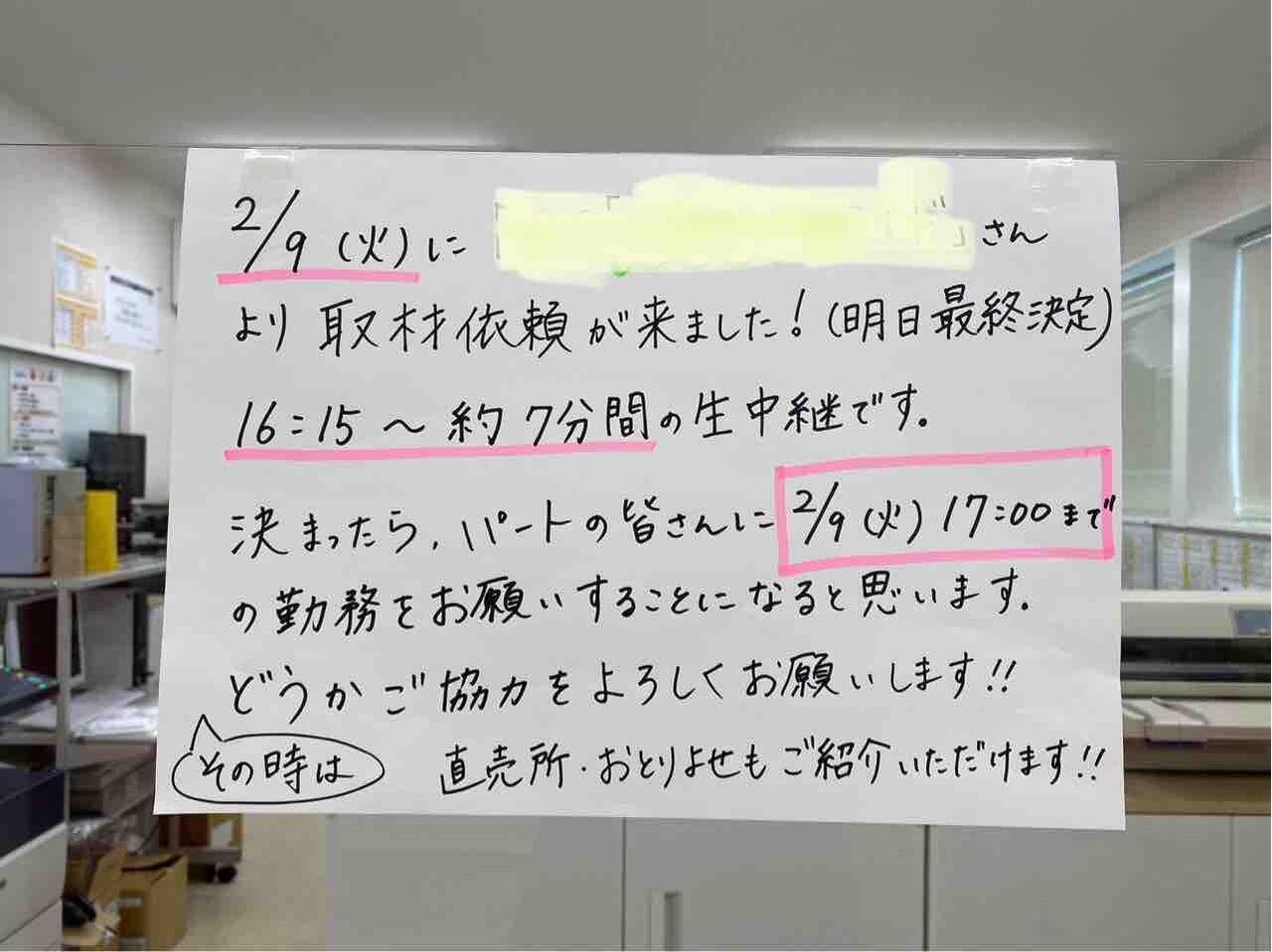 「もっとみんなが元気になる話ができなかったかなぁ」と朝礼のあと一人落ち込んでいると、とある地元のテレビ局からお電話をいただきました。