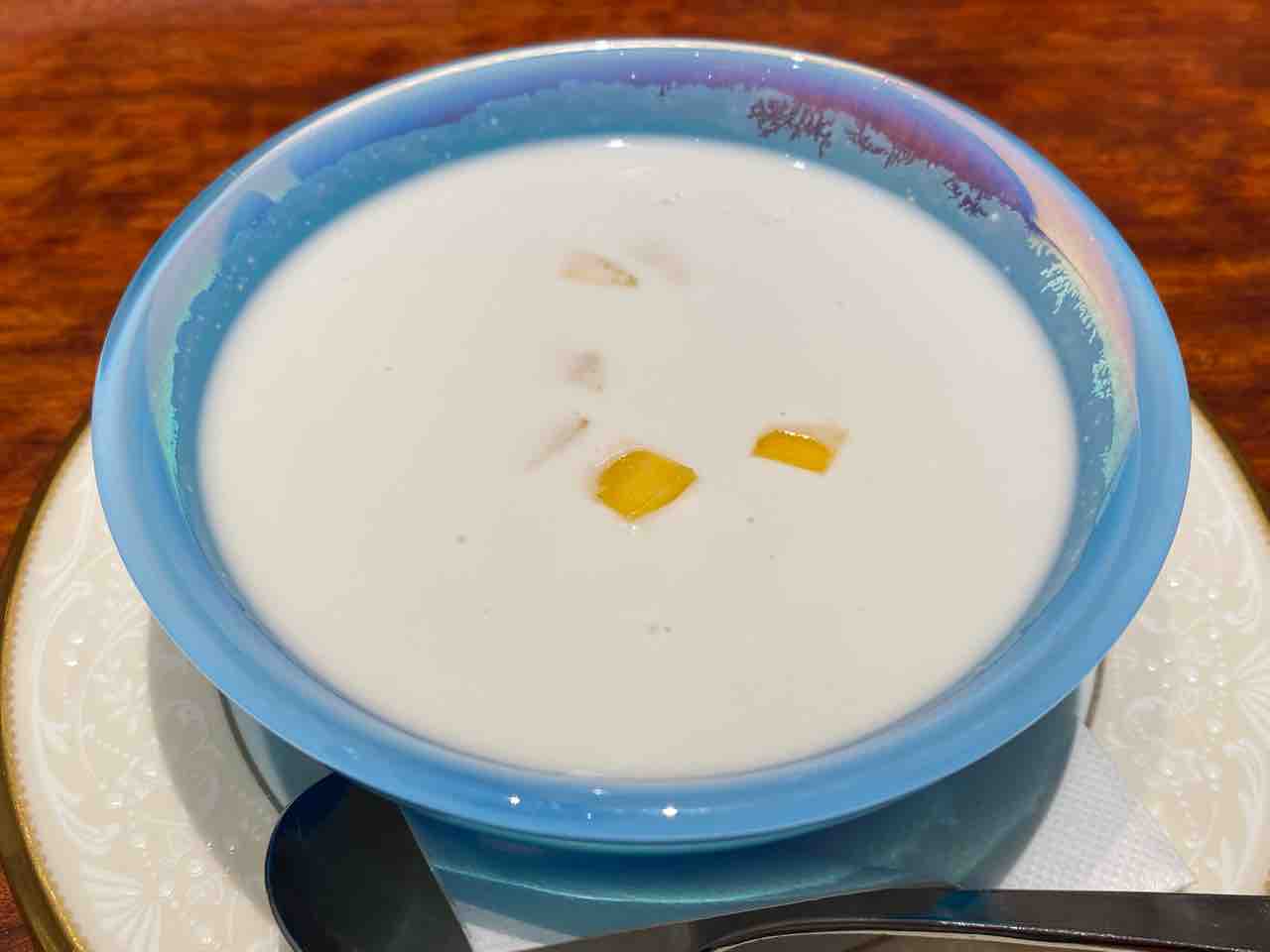 ランチデザートは、杏仁豆腐とマンゴープリンとココナッツミルクがあって、どれも美味しそうでかなり迷いましたが、結局タピオカ入りココナッツミルクにしました。