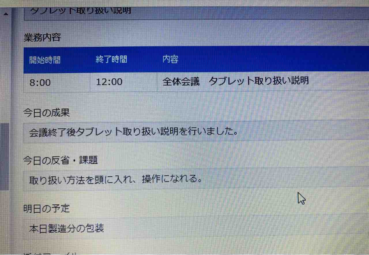 まずは、現在紙に書いてもらっている日々の業務日報を、来週からkintoneで書いてもらうべく、その操作方法を全員に教えました。