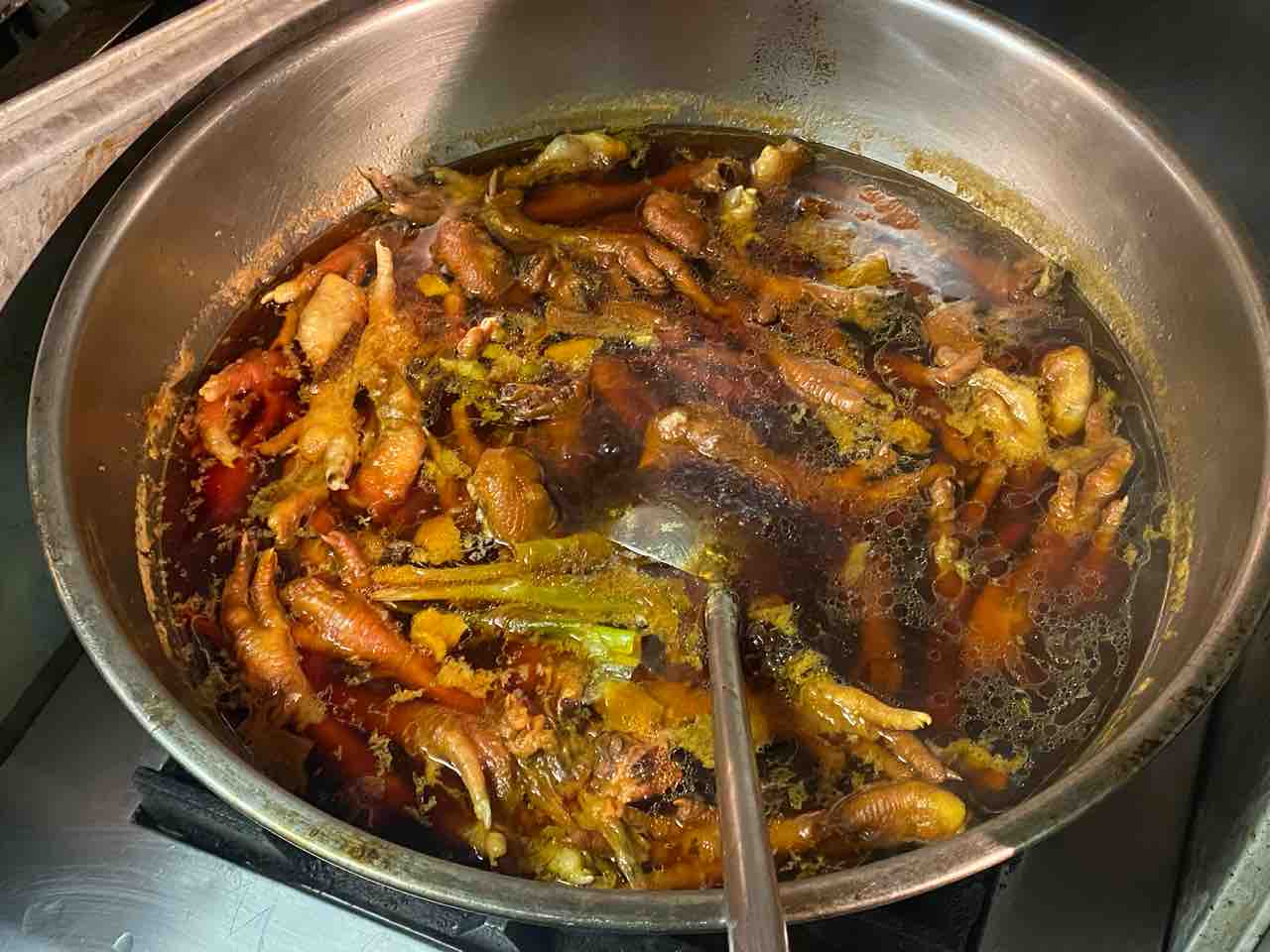 カラメル、もみじ(鶏足)、香辛料、ねぎ、生姜などを入れて、2時間ほど煮込みます。