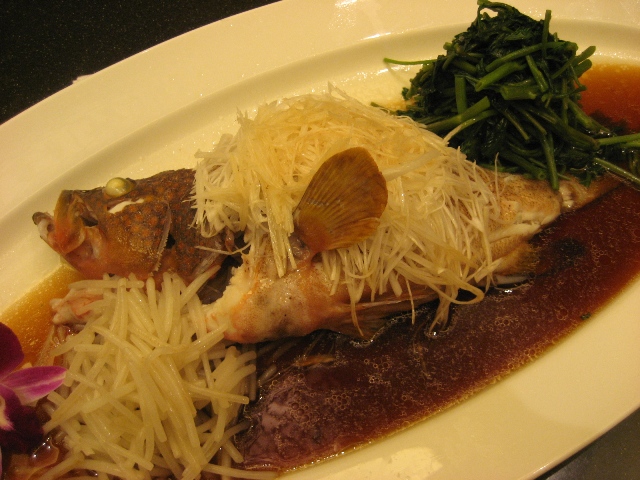 ←「アコウの姿蒸し 特製醤油ダレ 空心菜ともやし添え」です