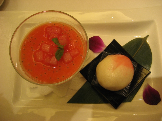 ← そして最後のデザートは、「特製杏仁豆腐西瓜ソース・桃まんじゅう」でした