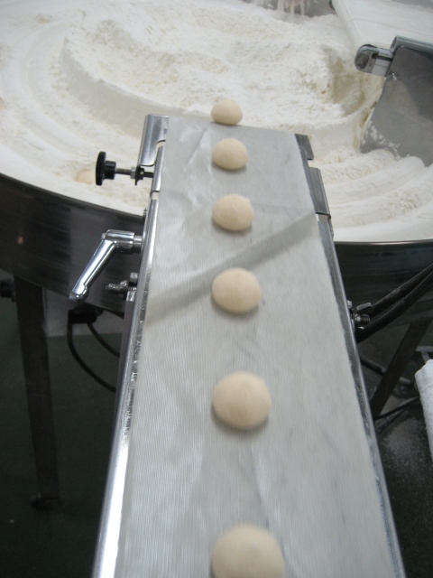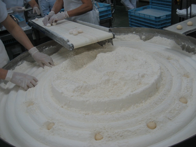 そして小麦粉が入ったターンテーブルの中に投入されていきます。