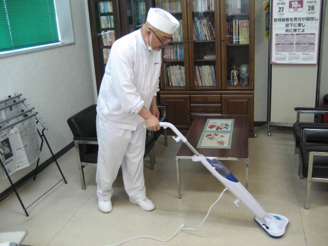 ← 常務は子供みたいな満面の笑みでモップを組み立てた後、さっそく会社の床を磨き始めました