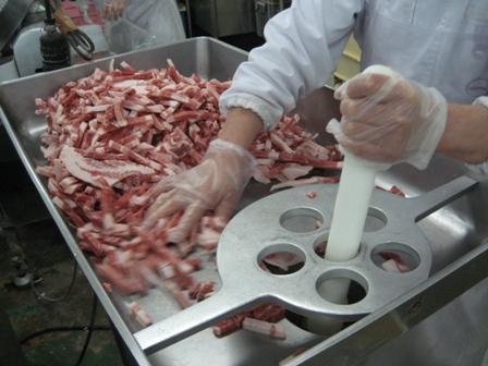 ← 長方形の肉をチョッパーにかけて、ミンチにしていきます。