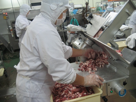 ← 厚めにスライスした肉を縦にセットして、細長い長方形になるようにカットしていきます。