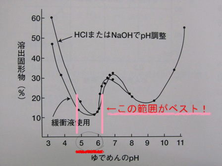 こちらの横軸はゆで湯のpH、縦軸はでん粉が溶け出すパーセントを示しています。