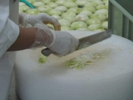 ← 白葱は、包丁で1本1本手切りで切っていますベテランのパートさんが手際よく細切りにしています
