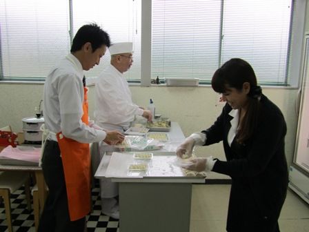 お買い求めいただいたお客様に「手包み餃子5個プレゼント」の企画をしたので、常務の包んだ餃子をみんなでつめています