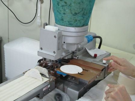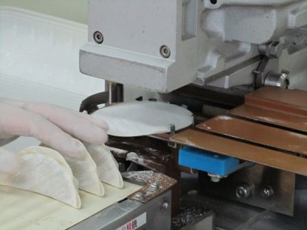 ← 25gのジャンボ餃子は、こちらの卓上の機械で作っています。餃子皮を置く人と、餃子を並べる人の2人1組で製造します