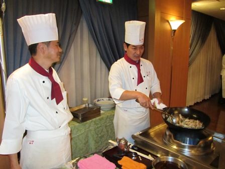 ← 料理の締めの麺料理は、会場でコックさんが実演しながら作ってくださいました