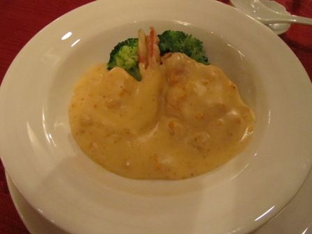 ← 「海老の広東風海胆クリーム煮」です。 このクリームは、裏ごしした蒸しウニと生クリームで作っているそうです