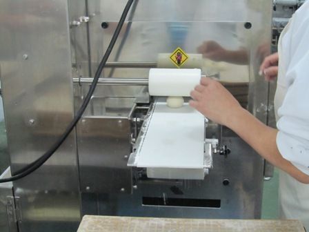 ← 反対側のレーンから出てきます。これは何の商品を作るテストをしているかというと、「寿桃」の製造のテストです。