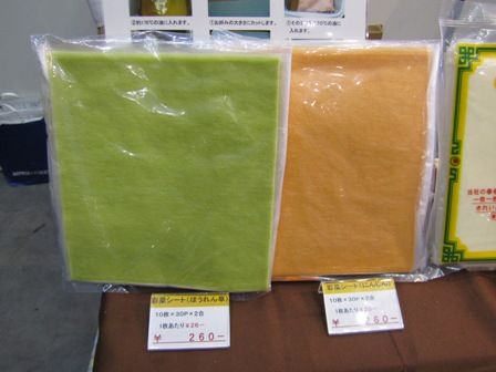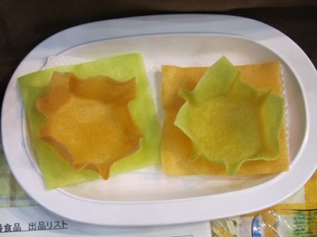 ← こちらは「彩菜シート(ほうれん草)」(左)と「彩菜シート(にんじん)」(右)です。それぞれほうれん草ペーストとにんじんペーストで色を付けています。(シート自体に野菜の味はほとんどしません)