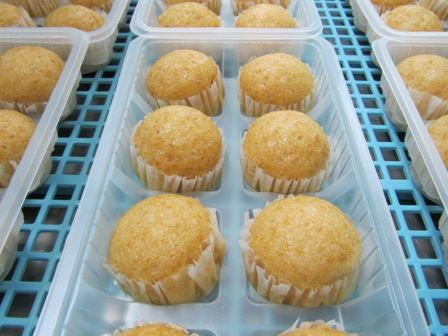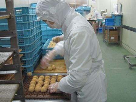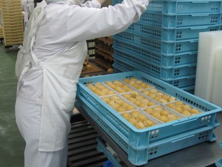 ← 蒸し上がったマーラーカオは、丸い型を外し、検品しながらトレーに並べていきます。工場中を甘〜い匂いが漂っていました