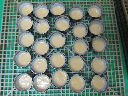 ← 生地を入れ終わった状態です。丸い型に入れているのは、蒸して膨らんだ時に形が一定になるようにです。