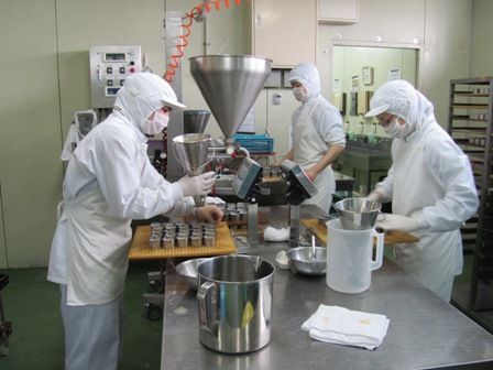 ← まず、充填機を使ってカップの中に生地を入れていきます。