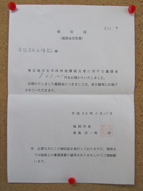 高島宗一郎市長の名前で領収書も発行していただきました。