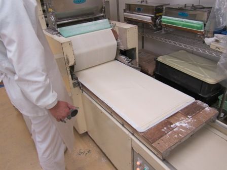 ← シート状にした生地は、「麺帯自動折畳機」という機械にかけて、更に圧をかけながら1ミリ以下の薄いシート状にしていきます。こちらの工程も動画でご紹介します