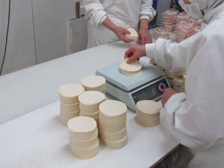 ← くり抜いた餃子の皮のグラム数を量り、袋に入れて包装すれば出来上がりです
