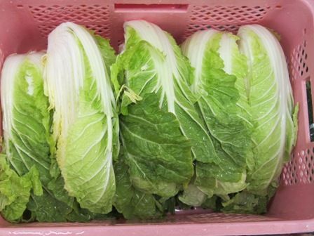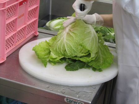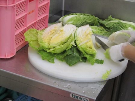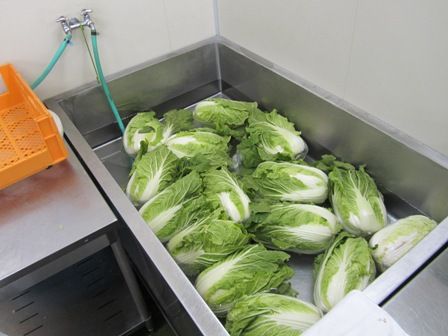 白菜のひとつひとつをチェックしながら、葉っぱの枯れているところは取り除き、ヘタのところに土がついていたりしたらキレイに水で洗い流していました。