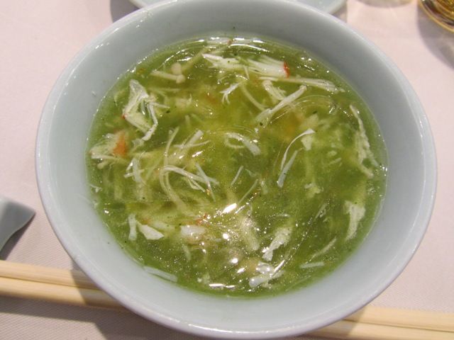 ← こちらは「フカヒレスープ 翡翠仕立て」です。翡翠色がとてもキレイで印象的でした