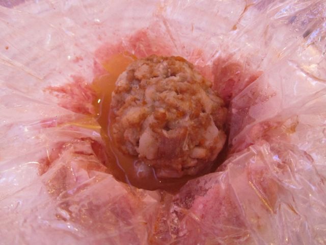 ← 中のセロハンを開けると、とってもジューシーな上海蟹入り肉団子が入っていました