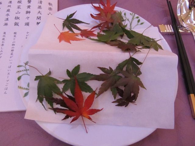 ← そして次の料理がこちら。お皿の上に紙が敷いてあり、その上に紅葉が散りばめられています