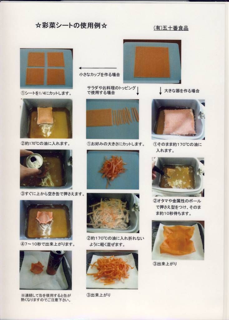 彩菜シートを四つ切りにして、熱した油の上に浮かべ、すぐに上から空き缶などで10秒ほど押さえて型を作れば出来上がりです