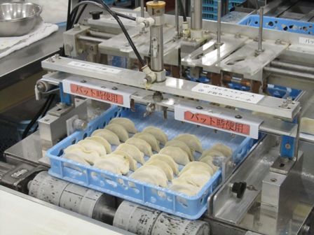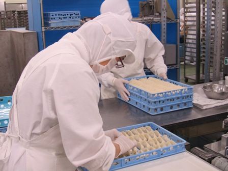 ← バットに入れられた餃子を、検品しながらキレイに並べていきます。