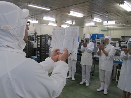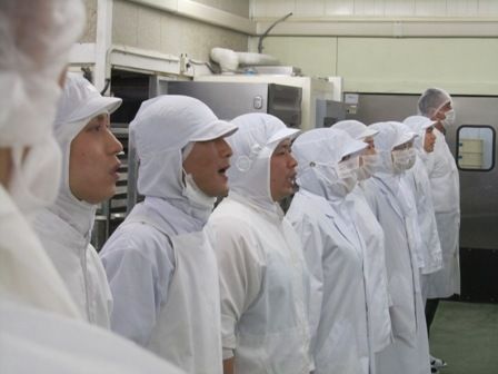 ← 「活力朝礼」というくらいですから、元気に大きな声を出すのが基本です。いつもは狭い会議室で練習しているので、部屋中に自分たちの声が響き渡っていましたが、機械音のする広い工場の中だと、自分たちが思っているほど声が通らずビックリ
