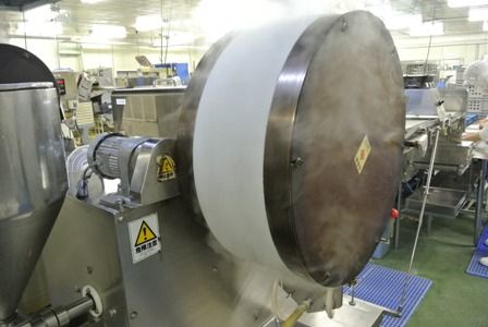 ← 春巻皮は、小麦粉を水で練った生地を、この大きな丸いドラムで焼きながら製造します。