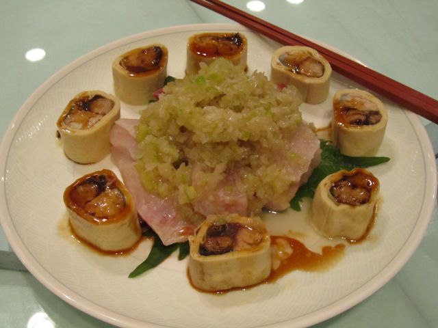 ブリの葱ソースと、「百頁」という豆腐を伸ばしたような皮でサバを煮込んだ物を巻いたものです。