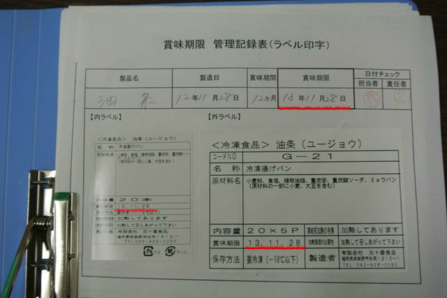 こちらは「油条」の管理記録表ですが、製造日(12年11月28日)、賞味期間(12ヶ月)、賞味期限(13年11月28日)を記入し、その下に実際に商品の袋に貼る一括表示シールと、外側のダンボールに貼る一括表示シールを貼っています。