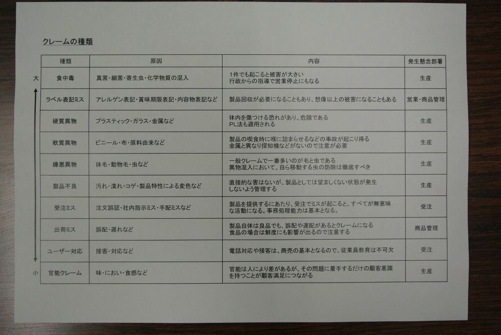 ← こちらは食品会社の「クレームの種類」について書かれた表です。起こしてしまうと被害が大きくなるものから順番に説明してあります。