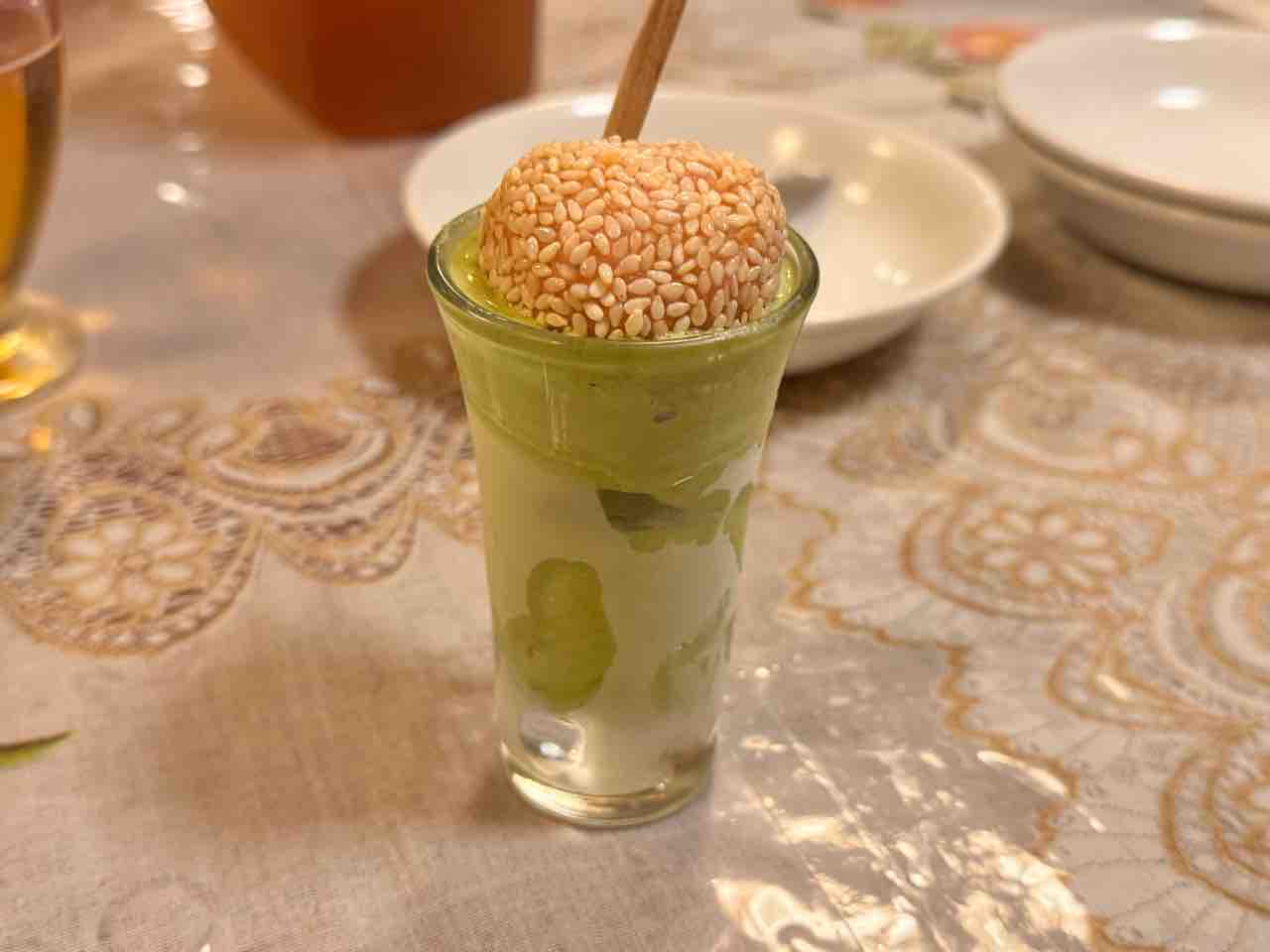 なんと「抹茶アイス」の上に「芝麻球(桜あん)」がのっています。