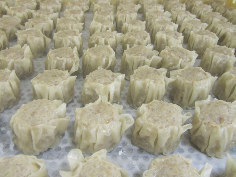 ← 焼売はこちらの卓上の機械で製造しています。皮を一枚一枚手でのせていくタイプのものですが、大きさも一定で形も手作りと同じくらいにキレイに仕上がります