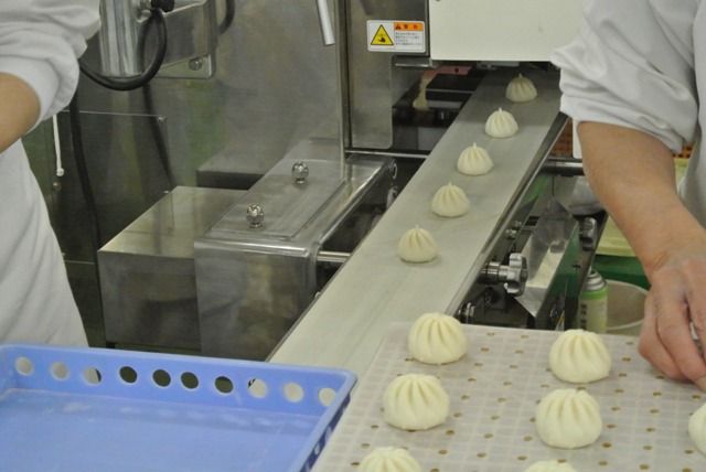 ← まずは包あん機という機械で、肉まんの具を生地でくるんでいきます。新しい機械を導入してから、ミニ包子の形がとてもキレイになりました