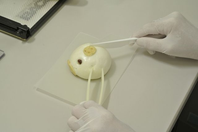 上にのっているグリーンピースはもちろん本物ではありませんが、外側に貼り付けている皮は、本物のシューマイの皮です。